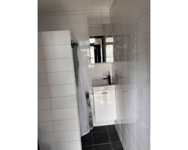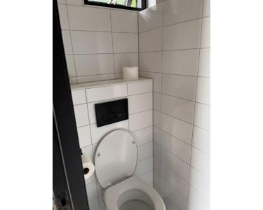 Das kompakte Badezimmer verfügt über eine hängende Toilette und einen separaten geräumigen Duschraum. Der Brunnen mit dem Badezimmerschrank rundet ihn ab.