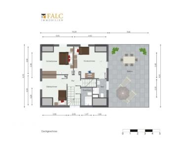 Das Dachgeschoss beherbergt drei Schlafzimmer sowie zwei Duschbäder, wobei in einem der Bäder kein Waschbecken und kein Fenster vorhanden ist. Eines der Schlafzimmer bietet einen direkten Zugang zur großen Dachterrasse mit schönem Blick in die Umgebung und den Garten. Von diesem Zimmer aus erreichen Sie auch eines der beiden Duschbäder.