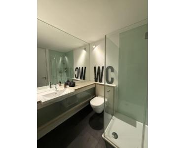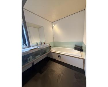 Die Wohnräume sind mit massivem Raucheiche-Stäbchenparkett ausgestattet. Der Eingangsbereich und die Badezimmer sind mit echtem Schiefer-Platten ausgelegt. Das große Badezimmer verfügt über ein Tageslichtfenster. Die Badezimmer-Einbauten sind Individualanfertigungen vom Schreiner. Ebenso sind die Garderobe, der begehbare Kleiderschrank maßangefertigt. Alle Türen sind deckenhoch und mit rahmenüberdeckenden Türblättern maßangefertigt.