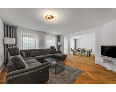 Das im Jahr 1911 erbaute Einfamilienhaus wurde Ende 2022 umfassend saniert und präsentiert sich heute in modernem, anspruchsvollem Stil mit zeitgemäßer Gebäudetechnik. Die Fassade erhält durch Vollwärmeschutz optimale Wärmeeffizienz, während dreifachverglaste Holzwender hervorragenden Wärme- und Schallschutz bieten. Hochwertigen Fliesen und Fischgrätparkett aus Eiche verbinden Wärme und Eleganz.