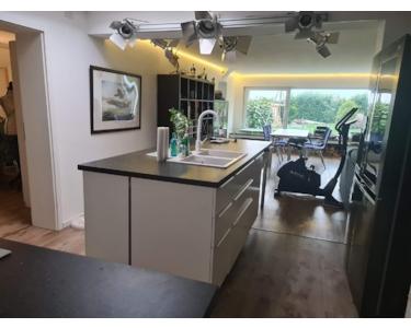 Die Böden sind qualitativ hochwertiges Vinyl. Die Wände sind feinverputzt. Eine neue Gasheizung mit Fußbodenheizung wurde im Erdgeschoss eingebaut, die obere Etage hat neue Heizkörper bekommen. Die untere Etage hat eine wunderschöne offene Einbauküche mit direktem Zugang zur Garage, oben wurden neue Anschlüsse verlegt, um eine Küche einzubauen. Das Haus hat überall hochwertige, einbruchssichere Fenster. Die Doppelgarage hat Internetzugang und ist vorbereitet für eine Wallbox und einen Wasseranschluss. Die Solaranlage hat 16.6 kWp und eine große Batterie, so dass man im Sommer komplett autark sein kann, auch bei komplettem Stromausfall. Es gibt einen kleinen Gewölbekeller mit Brunnen, einen großen Wasserspeicher für die Gartenbewässerung und einen weiteren großen Kellerraum. Man hat außerdem umfangreichen Stauraum unter dem Dach und natürlich in den riesigen Garagen. Die untere Terrasse ist überdacht und hat einen großen Whirlpool, im Garten gibt es einen Komposthaufen und ein Holzlager. Das untere Wohnzimmer hat einen Holzofen.