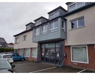 In der Nähe befindet sich ein Edeka-Markt, das Landkreisgebäude mit großen Grünanlagen