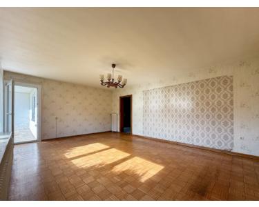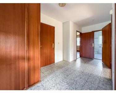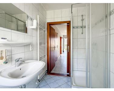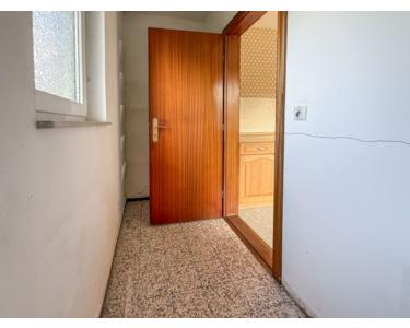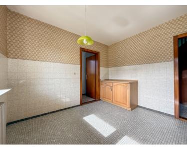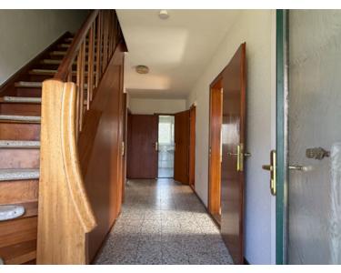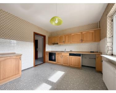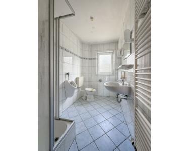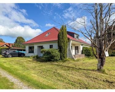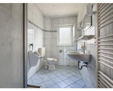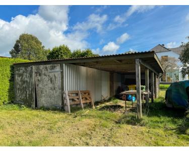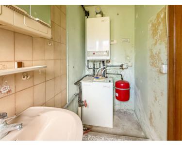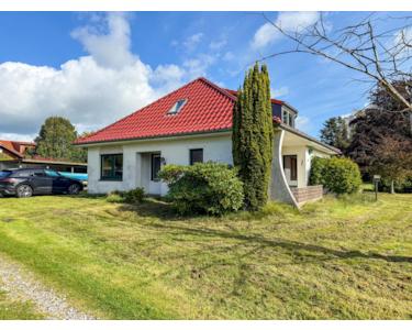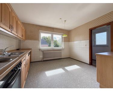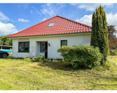 Von der zentralen Diele im EG geht es in die große Küche mit angeschlossener Speisekammer, den Wohnraum mit Zugang zur Terrasse und zum Garten, ein weiteres großes Zimmer sowie in das Duschbad. Eine Tür führt in einen kleinen Hinterflur mit Zugang zu einem zweiten Zimmer, zum Gäste-WC und mit einer Tür nach außen. Über die Treppe in der Diele geht es ins Dachgeschoss. Hier befinden sich 1,5 weitere Zimmer sowie ein kleines Bad mit WC, außerdem eine begehbare Abseite, die als Abstellfläche genutzt werden kann. Ein Keller ist nicht vorhanden. Wärme und Warmwasser kommen von einer Erdgas-Zentralheizung (Baujahr 2001). Im Außenbereich gibt es eine Garage mit Carport und Unterstellmöglichkeiten für z.B. Gartengeräte.