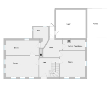 • Zahlreiche Nebenräume: Vorflur, Technikraum/Waschküche, Gewölbekeller, unbeheizte Räume im 2. Etage, Lager (ehem. Stall), Remise