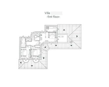 Im Obergeschoss befinden sich drei Schlafzimmer. Das erste Schlafzimmer verfügt über ein eigenes Badezimmer und einen Zugang zu einem privaten Balkon. Die anderen beiden Schlafzimmer teilen sich ein Badezimmer und ein WC, jedes hat einen eigenen halbkreisförmigen Balkon.