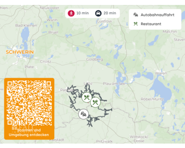 Auch die Autobahn A24 (Anschluss Suckow) liegt nur rund 15 km entfernt und bietet eine gute Anbindung in Richtung Hamburg und Berlin. Die Umgebung rund um Redlin ist landschaftlich reizvoll – mit der Müritz-Elde-Wasserstraße, dem Blanksee, dem Treptowsee und mehreren kleinen Naturschutzgebieten in der Nähe. So verbindet sich hier ländliche Ruhe mit einer soliden Grundversorgung und guter regionaler Erreichbarkeit.