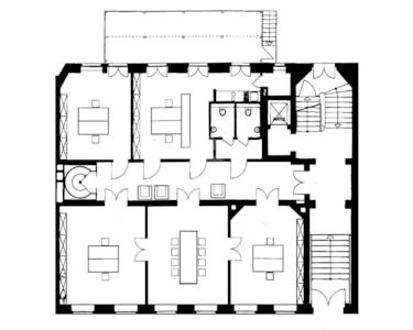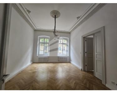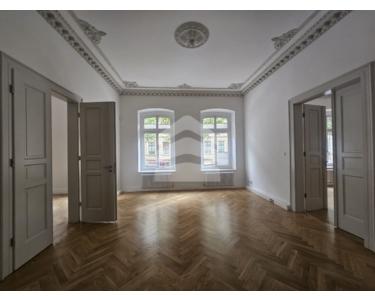 Die klassisch gestaltete Fassade ist ein Blickfang und schafft mit ihren großzügig angelegten Fenstern helle, lichtdurchflutete Räume. Die zum ruhigen Garten gelegene Terrasse verleiht dem Gebäude einen natürlichen Ruhepol und Rückzugsort. Die zur Vermietung stehende Bürofläche liegt im Hochpaterre des Gebäudes und wird über ein denkmalgerecht saniertes und sehr repräsentatives Treppenhaus erschlossen. Die Mietfläche ist aufgrund des Parkettbodens, der Flügeltüren oder auch der Stuckdecken von der Ausstattung her sehr hochwertig und wurde vollumfänglich renoviert. Im Souterrain befindet sich außerdem ein ca. 83 m² Raum, welcher als Konferenzraum, Sozialbereich oder als erweitere Lagerfläche genutzt werden kann.