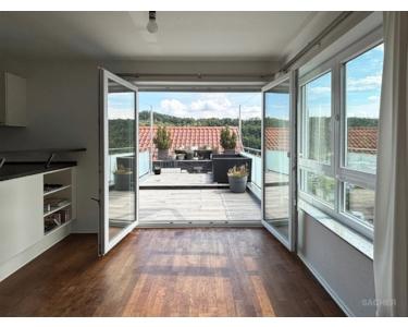 In Halbhöhenlage, in einem sehr gepflegten Wohngebiet gelegen, können Sie ihren Blick aus den Fenstern oder von der großen Dachterrasse über den Leonberger Stadtteil Ramtel und die gegenüberliegenden, bewaldeten Hügel schweifen lassen. Durch die süd/westliche Ausrichtung wird die Wohnung den ganzen Tag über mit Sonne und viel Tageslicht durchflutet.
