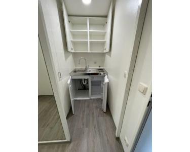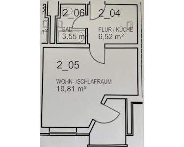 Die Wohnung besteht aus einem Zimmer mit angrenzendem Badezimmer, welches mit einer Badewanne ausgestattet ist. Außerdem ist eine kleine Küchenzeile vorhanden die aus einer Spüle, einem Kühlschrank und 2 Kochfeldern besteht.