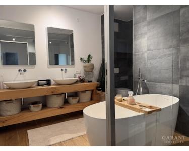 * zwei moderne Badezimmer, teilweise mit Wanne und Dusche