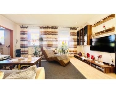 In offener Bauweise angegliedert ist das moderne Wohn-/Esszimmer, in dem ein strapazierfähiger heller Laminatboden verlegt wurde und das dank großer Fensterfronten hell erstrahlt.