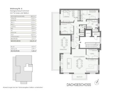 Die Wohnung bietet insgesamt ca. 164 m² Wohnfläche und ist ideal für Familien, Paare mit Platzbedarf oder das Arbeiten von zu Hause. Der offen gestaltete Wohn-/Essbereich mit direktem Zugang zur teilweise überdachten Dachterrasse mit Westausrichtung bildet das Herzstück der Wohnung – hier genießen Sie sonnige Nachmittage und entspannte Abende. Ein zusätzlicher Balkon zur Südseite erweitert das Freiluftangebot.