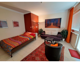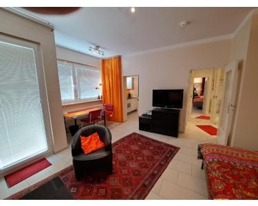 Großzügiges Zimmer: Schlafsofa, Ledersessel, Doppelbett (1,40 x 2,00 Meter mit Kaltschaummatratze und 2 Lattenrosten), Arbeitsbereich, bzw. Eßtisch für 4 Personen, Sideboard mit LCD-TV (94 cm), DVD-Player und CD-Radio-Stereoanlage. Gefliester Balkon: Tisch und zwei Stühle. Einbauküche: Vollständig ausgestattet mit Ceranherd, Mikrowellengerät, Kühlschrank, Kaffeemaschine, Wasserkocher, Besteck, Geschirr, Töpfen und Pfannen. Flur: Großer begehbarer Einbau-Kleiderschränke mit viel Stauraum. Bettwäsche, Handtücher, Bügeleisen, Bügelbrett und Staubsauger sind ebenfalls vorhanden. Südbalkon mit Tisch und 2 Stühlen. Duschbad: Toilette, Waschbecken, beleuchteter Spiegelschrank, Waschmaschine und Duschkabine.