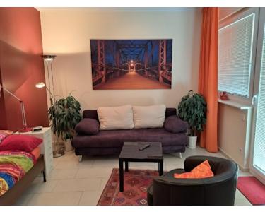 Ruhige und helle 1-Zimmer-Wohnung (35 qm) mit Duschbad, Einbauküche, Flur mit großem Einbauschrank; Süd-Balkon, Aufzug. Das Nichtraucher-Apartment befindet sich in der obersten Etage.