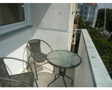 Living area: The spacious room with a balcony facing south has a comfortable sofa bed, one leather armchair, double-bed (queen size), dining table for 4, a cupboard with LCD-TV (94 cm), CD-/radio equipment. Kitchen: The built-in kitchen is fully equipped with a ceramic stove top, oven, microwave, fridge, coffee machine, kettle, cutlery, crockery, pots and pans. Hallway: Here you find one large walk-in closets with plenty of storage room and hanging space complete with bedding, towels, iron, ironing board and vacuum cleaner. Balcony: On the tiled balcony there a 2 chairs and a table. Bathroom: The bathroom possesses a shower unit, wash-basin, toilet, mirrored and illuminated cupboard and the washing machine. Italian ceramic glass tiles on the floor.