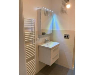 Im Bad befindet sich eine große Dusche und ein Waschbecken. Das WC ist separat.