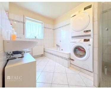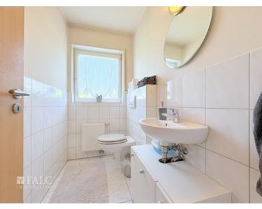 Das Badezimmer ist mit hochwertigen Fliesen – nahezu deckenhoch – versehen und verfügt sowohl über eine Badewanne als auch eine separate ebenerdige Dusche. Ein Waschmaschinenanschluss ist ebenfalls im Bad vorhanden. Auch im Gäste-WC wurden die Wände teilweise gefliest und passen sich optisch dem Gesamtbild der Wohnung an.