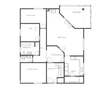 Zur rechten Seite des Eingangsbereichs erschließt sich der offene Wohnbereich. Die separate Küche ist praktisch geschnitten und verfügt über einen angrenzenden Abstellraum, in dem auch die Heizungsanlage untergebracht ist. Das geräumige Wohnzimmer mit Kamin bietet ausreichend Platz für einen gemütlichen Wohn- und Essbereich und führt direkt in den beheizbaren Wintergarten – ein idealer Rückzugsort für jede Jahreszeit. Von hier aus hat man Zugang zum traumhaften Garten, der zum Verweilen im Grünen einlädt.