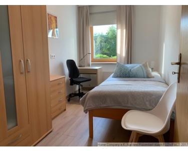 Das Schlafzimmer mit Einzelbett, Kleiderschrank und einem kleinen Arbeitstisch bietet ausreichend Platz für eine Person. Gäste können im Wohnzimmer auf der Schlafcouch übernachten.