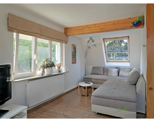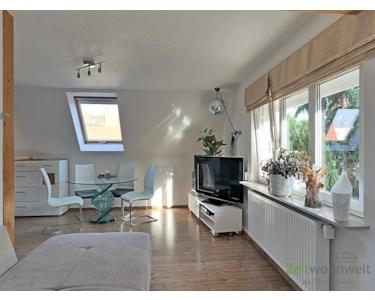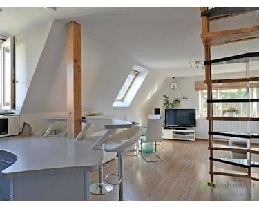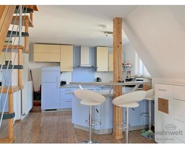 ### Please note the availability date! Bitte das Verfügbarkeitsdatum beachten! ### hübsche 2-Zimmer-Maisonette-Wohnung in ruhiger, grüner Wohnlage; Gartenmitnutzung, Waschmaschine und WLAN inklusive; großes Wohnzimmer mit extravaganter Wohnküche mit Rund-Tresen und Barhockern, gemütliche Sitzecke mit TV, (die Discokugel kann auf Wunsch heraugenommen werden); Bad mit Dusche und WC, Wohnungsflur mit Garderobe; im Wohnzimmer führt eine (verschließbare) Raumspartreppe in den Spitzboden mit Schlafzimmer (das dreieckige Fenster kann mit einer ferngesteuerten Außenjalousie verdunkelt werden!); Abstellkammer mit Regalen; ein fester PKW-Stellplatz kann für 25,00 Euro angemietet werden; Pauschalmiete 695,00 Euro bei 1 Person; wird an max. 3 Personen vermietet; monatlicher Heizkostenzuschlag 40,00 Euro von Oktober bis einschließlich April; Kaution 1.000,00 Euro; eine Haftpflichtversicherung ist nachzuweisen; Mindestmietdauer 6 Monate; Endreinigung Mietersache; Pflichtangaben zum Energieausweis: Energieausweis gültig bis: 11.05.2030; Baujahr Gebäude: 1936; Energieausweis: nach Verbrauch; Energieverbrauch: 93.8 kWh/(m²a); Energieeffizienzklasse: C; Primärer Energieträger: Erdgas H