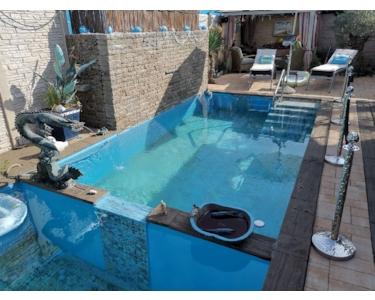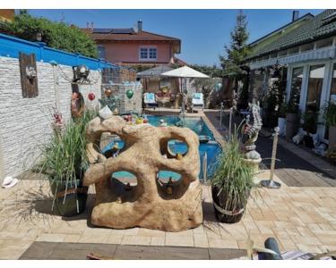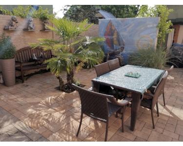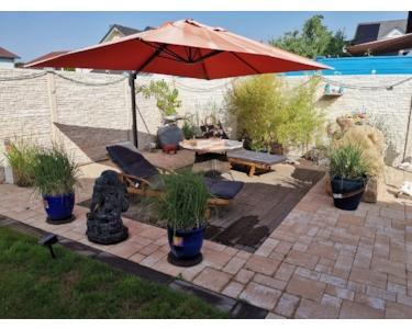 Das Haus befindet sich in einer verkehrsarmen Seitenstraße. in Sinzheim - Kartung . Sehr Ruhige Lage, Garage und Carport für 3 PKW Standplätze, überdacht, Sonne von morgens bis Abends, die gesamte Garten/ Pool (9x3 m mit Wasserfall) Aussenanlage ist in einem sehr gepflegten, pflegeleichtem Zustand. Pavillon mit Sitzbereich, Olivenbaum 120 Jahre alt, Pavillon mit Whirlpool, traumhaft angelegt mit Palmen und Pampasgräsern, viel Platz zum Grillen und feiern, umgeben mit einem Betonsichtschutzzaun in mediterranen Stil, Relaxen und genießen, für Ruhesuchende.