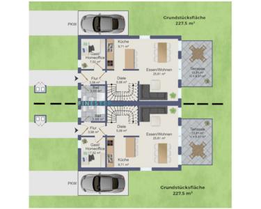 - Grundstück: ca. 227,5 m² (real geteilt)