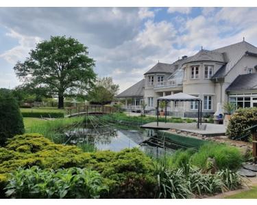 Die großzügige Vorgarteneinfahrt, der strukturierte Garten mit einem Fischteich und einem angrenzenden Waldpark, umschließen das Zwei-Familienhaus mit seinem Wellnessbereich und Nebengelass.