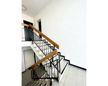 Treppenhausmodernisierung: Das Treppenhaus wurde komplett neu verputzt, gestrichen und mit einem modernen Beleuchtungskonzept sowie einem neuen Schalterprogramm ausgestattet.