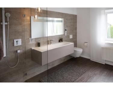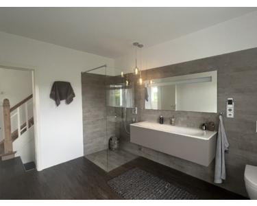 Im Erdgeschoss erwartet Sie ein stilvolles Duschbad mit hochwertigen Armaturen von Villeroy und Boch, einer ebenerdigen Dusche, einem hochwertigen modernen Waschtischunterschrank, Spiegel und passender Beleuchtung.