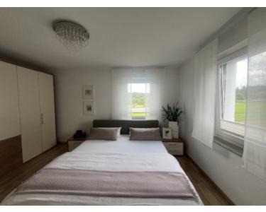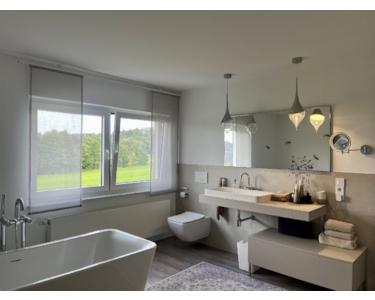 Im Obergeschoss finden sich drei gut geschnittene Schlafzimmer sowie ein weiteres Badezimmer, das die hochwertige Ausstattung des Erdgeschosses aufgreift und zusätzlich mit einer freistehenden Badewanne mit Blick auf Wald und Wiesen für besonderen Komfort sorgt.
