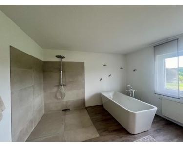 Auch hier erwarten Sie eine ebenerdige Dusche, ein moderner Waschtischunterschrank, Spiegel und geschmackvolle Lampen ein Ort, der Wellness-Charakter und Naturnähe perfekt verbindet.