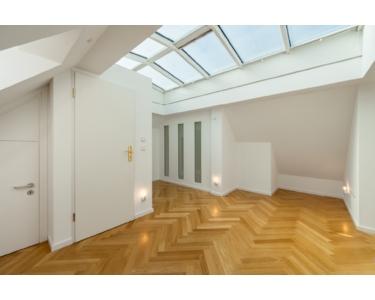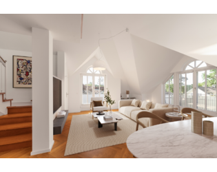 Der grosszügige Wohnbereich beeindruckt mit zwei rund drei Meter hohen Dachgauben, offener Giebelhöhe von über vier Metern und bodentiefen Fenstern mit edlen Messingbeschlägen. Von hier aus gelangt man auf den Süd- und Ostbalkon. Ein Kaminanschluss ist vorbereitet.