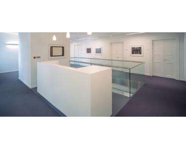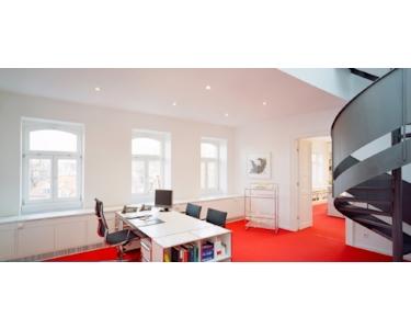 Die Bürofläche besticht durch ihre gehobene Ausstattung, zu der z. B. elegante Glastrennwände sowie eine hochwertige Cat7-Datenverkabelung gehören.