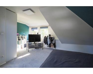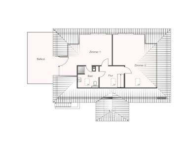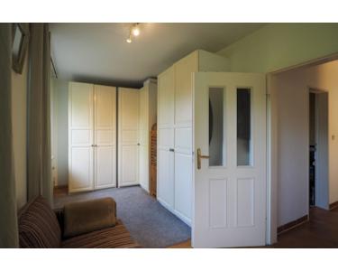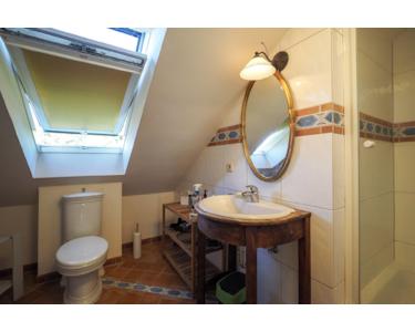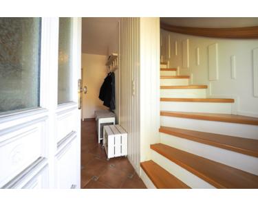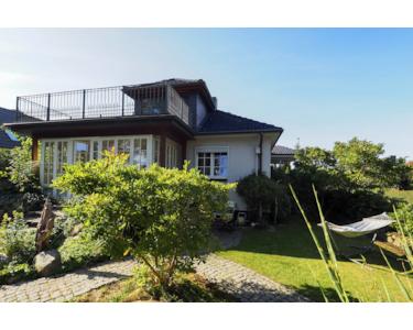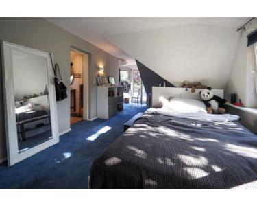Eine geschwungene Holztreppe führt ins Dachgeschoss. Hier gibt es zwei große Zimmer und ein weiteres Duschbad. Von einem der Zimmer gelangt man auf den Balkon mit herrlichem Blick in den schönen Garten.