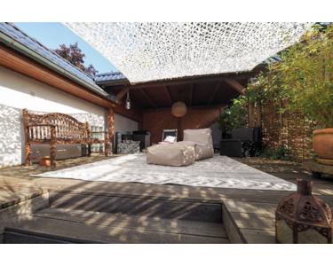 Blick vom Balkon auf die lauschige Sitzecke im Grünen