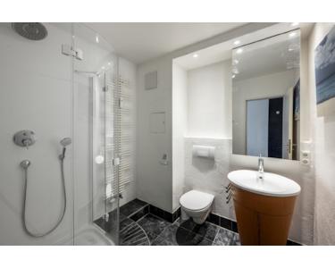 Das Badezimmer ist ebenso ein Hingucker: Es ist mit einem Philippe Starck Waschbecken, einem Spiegelschrank, einem Handtuchheizkörper und einer modernen Glasdusche ausgestattet und erfüllt höchste Ansprüche an Design und Funktionalität.