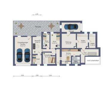 Im Untergeschoss befinden sich ausgebaute Räume mit einer zusätzlichen Fläche von 68 qm. Ebenfalls mit Bad, Küche und Schlafräumen. Hier angrenzend erreichen Sie auch die neue Doppelgarage mit Sektionaltor, einen kleinen Innenhof, sowie 4 Kellerräume mit Technik und Stauplatz.
