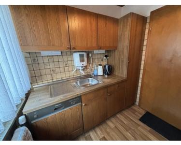 Im Erdgeschoss gibt es ein großes L- förmiges Wohnzimmer, eine praktische Küche mit nostalgischer Einbauküche aus den 80-zigern, ein Gäste- WC, sowie ein Schlafzimmer, das zur Gartenseite liegt. Vom Wohnzimmer kann man auf eine ansprechende Sonnen- Terrasse hinaustreten.