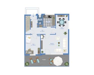 Besonders hervorzuheben ist der großzügige Wohnbereich, der zum Entspannen und Verweilen einlädt. Er ist L- förmig geschnitten und in Wohn- und in einen Essbereich aufgeteilt.