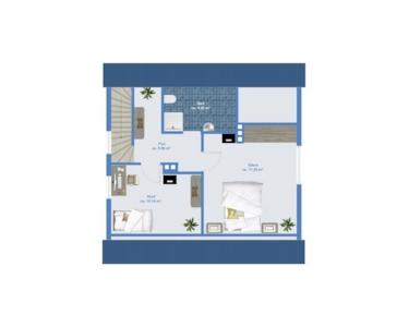 Im oberen Wohnbereich liegen zwei weitere Schlafzimmer und ein großes Badezimmer.
