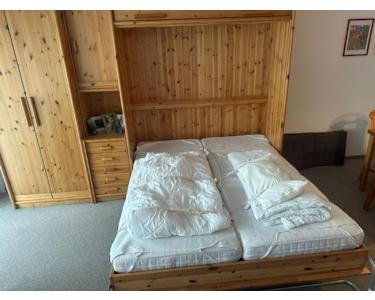 Flur mit Garderobe, Schlafzimmer mit 2 Einzelbetten, Bad mit Dusche, wandhängendem WC, Handtuchheizkörper, Waschmaschinenanschluss und Einbauschrank, Wohn-, Ess und Schlafzimmer mit offener Pantryküche und Schrankdoppelbett, große Loggia in S/O-Lage, Kellerraum.