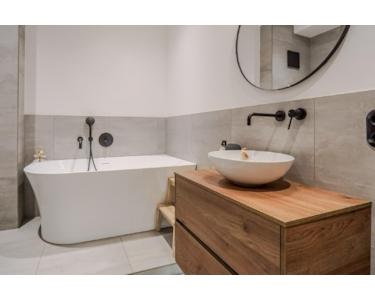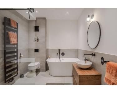 Das Badezimmer wurde 2023 hochwertig renoviert und ist mit einer begehbaren Regendusche, Badewanne, modernen großformatigen Fliesen (60 x 60 cm), einem Handtuchheizkörper sowie einem stilvollen Waschtisch und WC mit Vorwandinstallation ausgestattet.