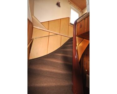 Treppe: Holztreppe mit einseitigem Handlauf und Teppich belegt