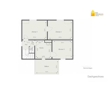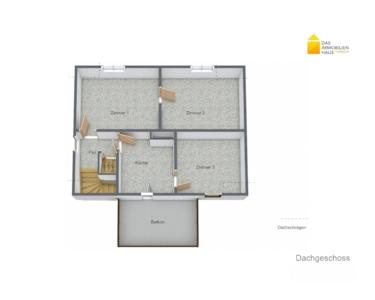 Dachgeschoss: Flur inkl. Treppenhaus, 3 Zimmer, Küche, überdachter Balkon