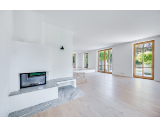 Das großzügige Wohn- und Esszimmer mit überdurchschnittlich hohen Decken, offener Küche und Kamin bildet das Herzstück des Hauses. Von hier aus öffnet sich der Blick in den traumhaften Außenbereich mit Pool, der direkt betreten werden kann und so den Wohnraum ideal nach draußen erweitert.