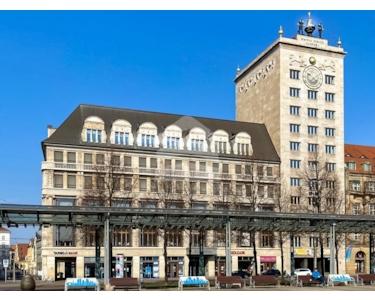 Das Geschäftshaus mit der markanten, historischen Fassade wird über einen zentralen Eingangsbereich und moderne Aufzuganlagen erschlossen. Die Mietflächen sind derzeit bereits ausgebaut, können jedoch entsprechend des Raumprofils des Mieters aufgeteilt und ausgestattet werden. Im Gebäude haben sich bereits renommierte Unternehmen sowohl auf den Büro- als auch den Einzelhandelsetagen angesiedelt. Die Fläche im 5. Obergeschoss verfügt über ca. 415 m² und besticht durch den außergewöhnlichen weitläufigen Blick über die Leipziger City.