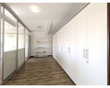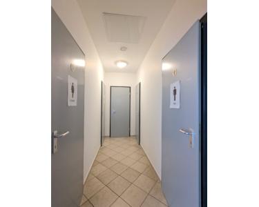 Ergänzt wird die Büroeinheit durch separate, zeitlos gestaltete Sanitäranlagen für Damen und Herren, die einen modernen und funktionalen Standard bieten. Zudem steht Ihnen eine Küche zur Verfügung – ideal für Pausen. Ein praktischer Lagerraum innerhalb der Einheit schafft zusätzlichen Stauraum für Materialien, Akten oder Technik.