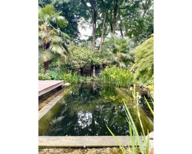 •Großzügige, überdachte Terrasse mit Blick auf einen wunderschönen Schwimmteich im Garten