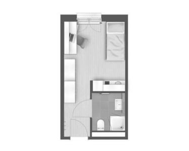 Die Wohnung ist komplett und zeitlos möbliert mit Einzelbett, ausziehbarem Schreibtisch, Stuhl, Hocker, Schrankkombination und Hängeregal. An der zum Zimmer hin liegenden Badwand befindet sich die Küchenzeile mit Kühlschrank, Ceranfeld und Mikrowelle sowie Stau- und Ablageflächen in Hänge- und Unterschränken.