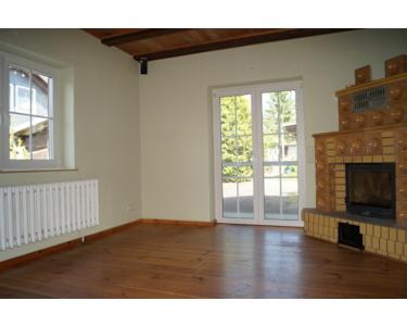 Durchdacht ist ein Zugang durch eine verschließbare Tür direkt von der Küche in den Wohnbereich, welcher großzügig gestaltet ist. Eine optische Trennung in 2 Abschnitte wird durch eingearbeitetes sichtbares Gebälk erreicht. Ein uriger Kamin sorgt für zusätzliche Gemütlichkeit und wohlige Wärme in der kalten Jahreszeit. Bodentiefe Fenster im Wohnbereich ermöglichen einen entspannten Blick ins Grüne und gestatten einen Zutritt auf die Terrasse und den Garten. Genießen Sie hier Ihr Frühstück in den ersten Sonnenstrahlen oder einen lauschigen Sommerabend bei einem Gläschen Wein.